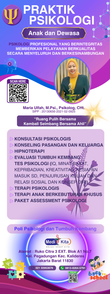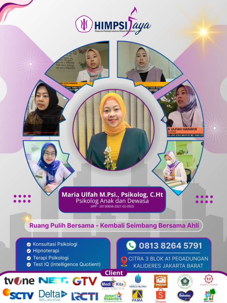 Pastikan anda melakukan konsultasi atau penanganan pada psikolog yang tepat yaitu Maria Ulfah, M.Psi., Psikolog merupakan psikolog senior yang berpengalaman dan memberikan solusi terbaik bagi anda serta putra-putri anda yang mengalami kendala di berbagai hal.